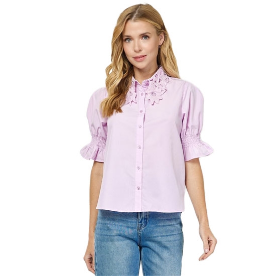 Blusa de manga corta con cuello camisero decorado con delicado bordado floral y mangas con detalle fruncido. Su corte recto y tela ligera la convierten en una prenda fresca y elegante, ideal para combinar con jeans, faldas o pantalones en un look casual o semi-formal.