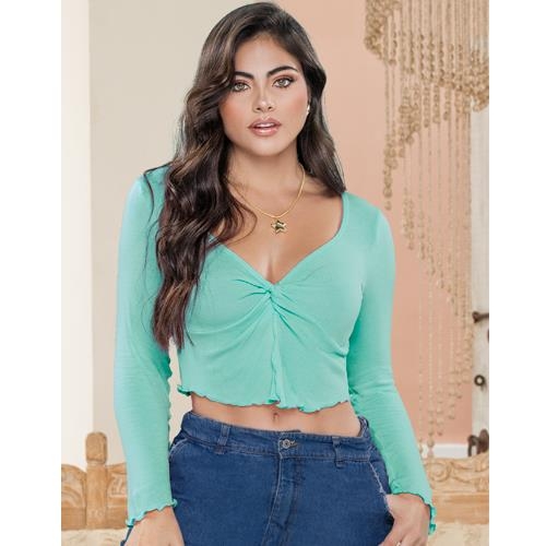 Blusa crop top en color turquesa con manga larga, diseño fruncido en el centro que aporta un toque moderno y femenino. Ideal para combinaciones casuales y frescas, perfecta para días cálidos. También puede llamarse top manga larga, blusa corta o top ajustado.