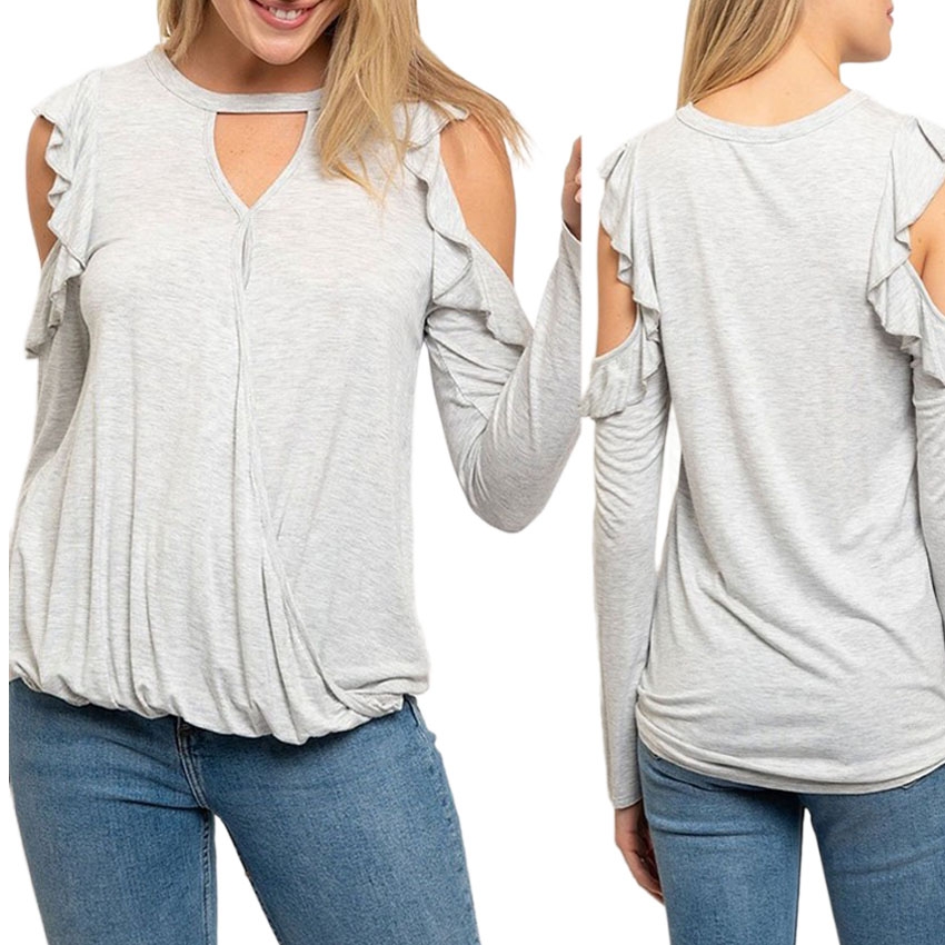 Dale un toque sofisticado y moderno a tu look con la Blusa Grey Elegance, confeccionada en un tejido suave y ligero que combina 83% viscosa, 13% poliéster y 4% elastano para un ajuste cómodo y elegante. Su diseño con hombros descubiertos y delicados volantes agrega un aire femenino y chic, ideal para combinar con jeans o pantalones de vestir. Perfecta para cualquier ocasión donde quieras lucir fresca y con estilo.