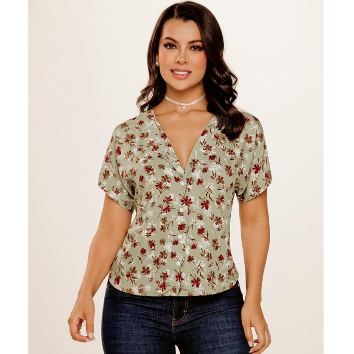 Blusa de tejido plano ligero con estampado floral romántico. Presenta escote en V, manga corta y abotonado frontal para un ajuste cómodo y favorecedor. Fresca y versátil, perfecta para combinar con jean, falda o pantalón para looks casuales o arreglados.