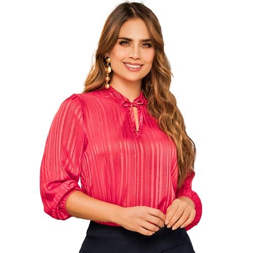 Blusa elegante en tono fucsia con mangas 3/4 que terminan en puño ajustado. Presenta un lazo delicado en el cuello que aporta un toque femenino y sofisticado, ideal para eventos formales o looks de oficina.