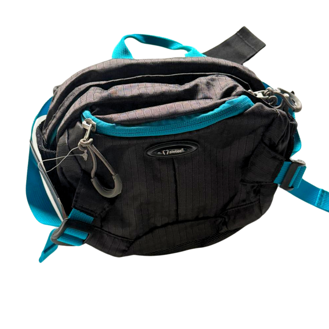 Canguro compacto color negro con turquesa, ideal para viajes o uso diario. Incluye compartimentos con cierre y correa ajustable para mayor comodidad.