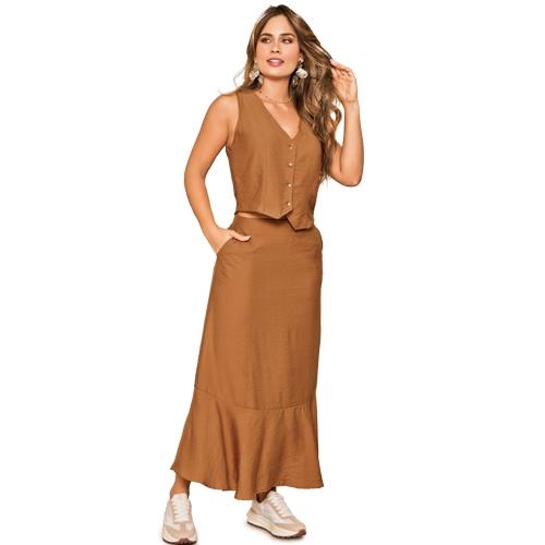 Este conjunto en tono camel es ideal para quienes aman los looks relajados pero con estilo. Incluye chaleco con botones y falda midi con vuelo, perfecto para un día cómodo sin perder elegancia.