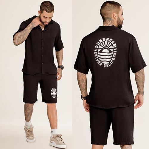 Set de dos piezas en tejido plano suave y fresco: camisa de manga corta con botones y short a juego. Estilo urbano con gráfico posterior “Ventura California” que aporta identidad sin perder comodidad. Versátil para el día a día: úsalo con zapatillas para un look relajado y moderno.