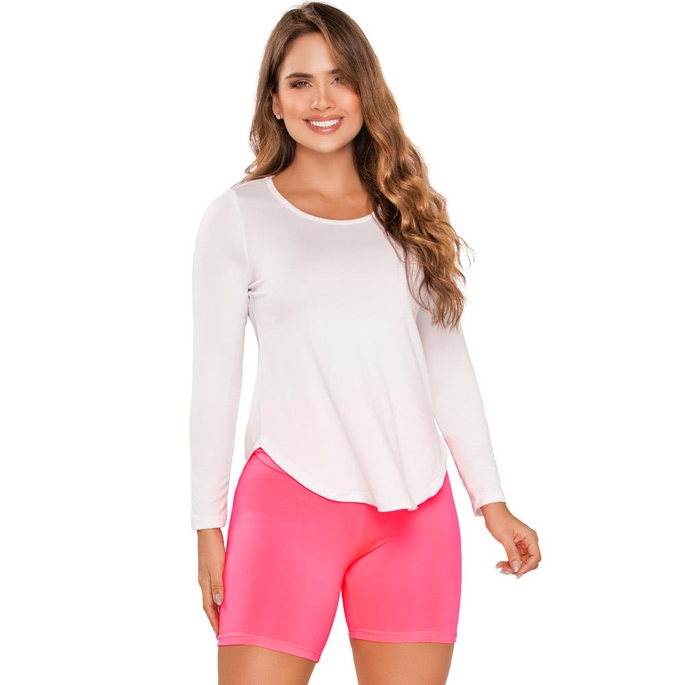 Luce fresca y cómoda con este conjunto perfecto para días activos o relajados. La blusa blanca de manga larga ofrece un corte ligero y versátil, mientras que el short tipo biker en rosa neón aporta un toque vibrante y moderno.