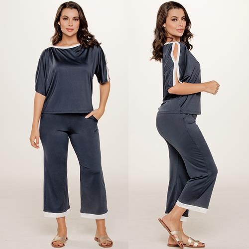 Conjunto de dos piezas en polilycra suave y elástica que combina estilo y comodidad. Top de cuello amplio con aberturas en hombros y franja en contraste; pantalón culotte de caída fluida con pretina cómoda. Un set versátil y elegante para lucir impecable en cualquier ocasión.