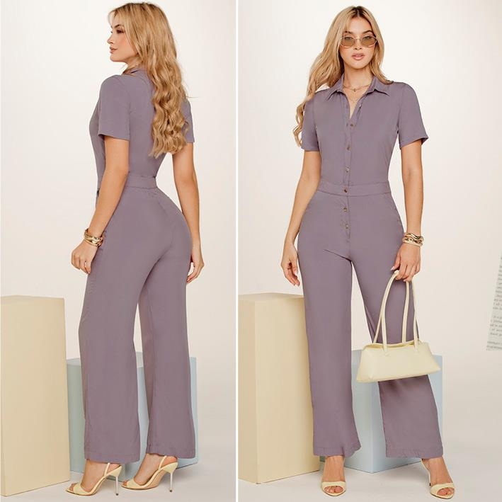 Enterizo de tejido plano súper suave con cuello camisero y botonadura frontal. La cintura alta estiliza y define, mientras que el pantalón de pierna ancha aporta caída fluida y movimiento elegante. Un básico sofisticado y cómodo para elevar tus looks de oficina o noche.
