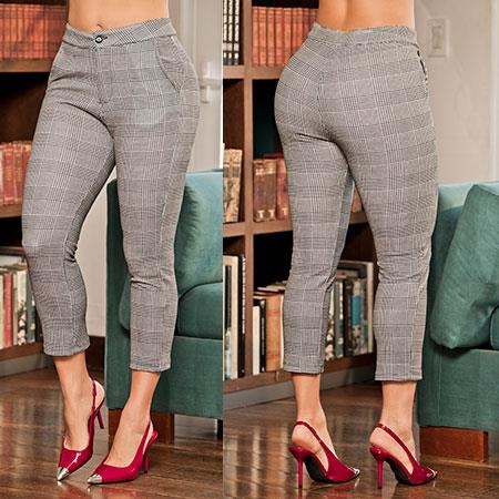 Este elegante pantalón tipo capri para mujer con diseño de cuadros gris es ideal para un look sofisticado y moderno. Su corte ajustado estiliza la figura, mientras que su largo tobillero lo convierte en una prenda perfecta para el trabajo, salidas o eventos semi formales.