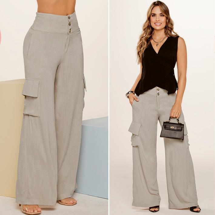 Pantalón de lino spandex con caída suave y tiro alto que define la cintura. Presenta pretina ancha con triple botón, pierna ancha fluida y bolsillos cargo laterales para un estilo moderno y elegante. Fresco, cómodo y perfecto para elevar looks casuales o de oficina.