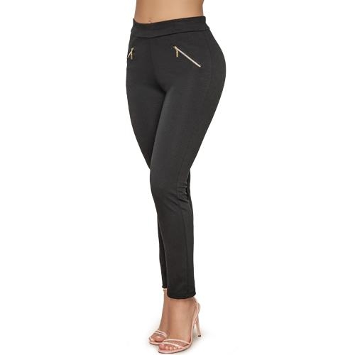Este pantalón pitillo gris de tiro medio es el equilibrio perfecto entre estilo y confort. Su diseño ajustado realza la silueta, mientras que los detalles de cierres dorados decorativos le dan un toque moderno y sofisticado. Ideal para outfits casuales o de oficina.