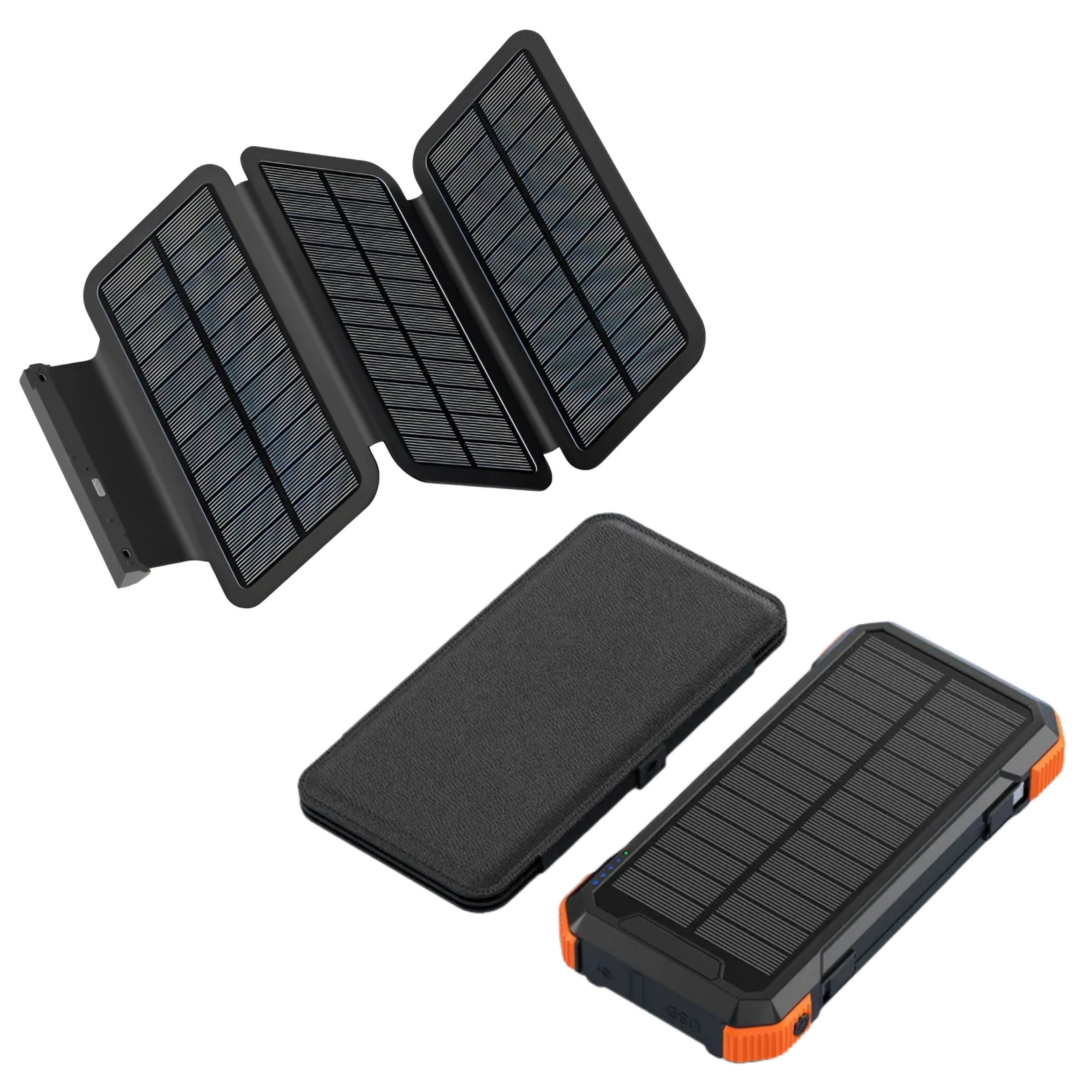 Panel solar desmontable y plegable con diseño 5:4 para recargar con la luz del sol. Aunque su carga es lenta, es una opción confiable en situaciones sin electricidad. Cada pieza de panel solar es de 1.6w