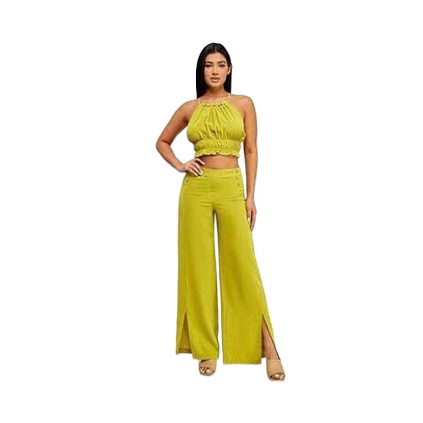 El top corto con cuello halter y detalle fruncido aporta un aire juvenil y chic, mientras que el pantalón de tiro alto y pierna ancha con aberturas frontales estiliza la figura y añade un toque sofisticado. Su color vibrante lo convierte en un conjunto versátil, ideal tanto para el día como para la noche.