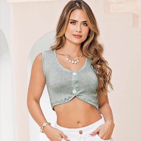Top corto sin mangas en tono gris claro, con detalle de botones frontales y diseño entallado que realza la silueta. Perfecto para looks casuales y frescos en temporadas cálidas. También puede llamarse crop top, top de botones o blusa corta.