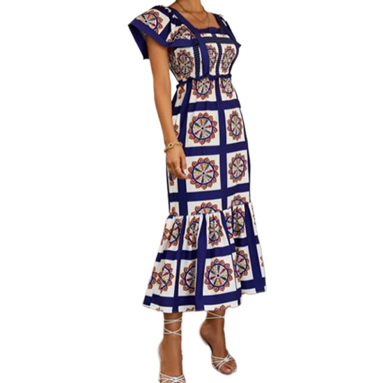 Este vestido de la marca Miss Kelly combina estilo y comodidad. Fabricado con un 55% de algodón y 45% de poliéster, ofrece frescura y durabilidad. Su diseño largo con estampado geométrico en tonos azules destaca por su elegancia y versatilidad, ideal para ocasiones casuales o semi-formales. Presenta mangas cortas con detalles amplios, cintura ajustada para realzar la figura y un delicado volante en la parte baja para un toque femenino y sofisticado.